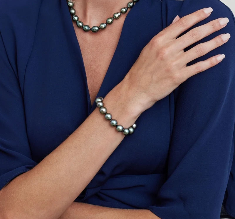 This stunning black Tahitian Pearl Bracelet features Dark Charcoal Grey body colors kissed with a shimmeringconfection of Blue-Green, Green and Steelovertones. This is a gorgeously colorful bracelet that any woman would love to own! The pearls feature anbeautifully matchedlayout withTrue Round pearls and sparkle with bright, crisp Luster.