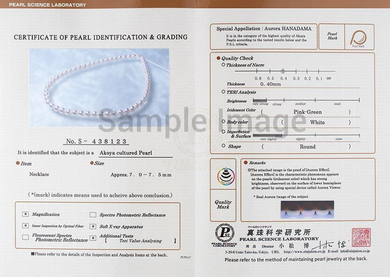 Each Hanadama Collection Necklace arrives with its own numbered Pearl Science Laboratory certificate from Tokyo, Japan, detailing the pearls' surface quality, nacre thickness and x-ray results. Your new Hanadama Akoya Pearl Necklace arrives secured in a fine Jewelry Presentation Box for you to keep and is accompanied by a certificate of authenticity and Pearl Care Instructions.