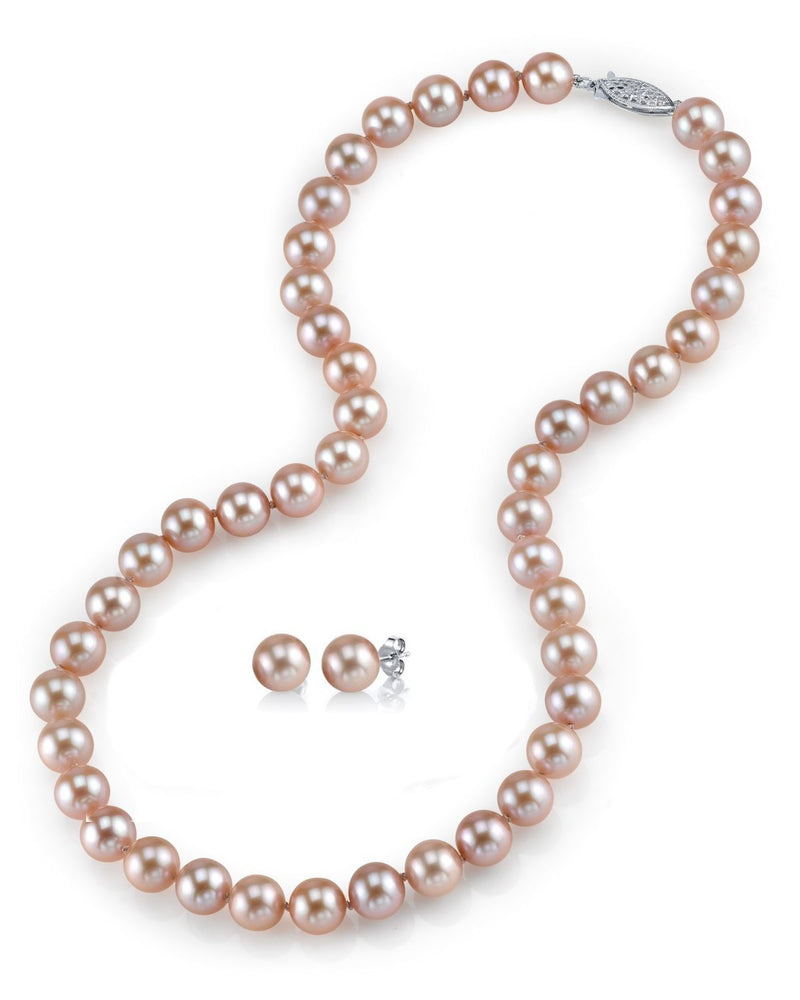 This lovely pearl set would make a great gift for any occasion! The set includes a gorgeous 7.0-7.5mm Pink Freshwater pearl necklace with matching 7mm pearl stud earrings. The set is available in either AAA or Gem quality. The stud backings and clasp are both 14K gold and will be matched according to the gold color chosen.