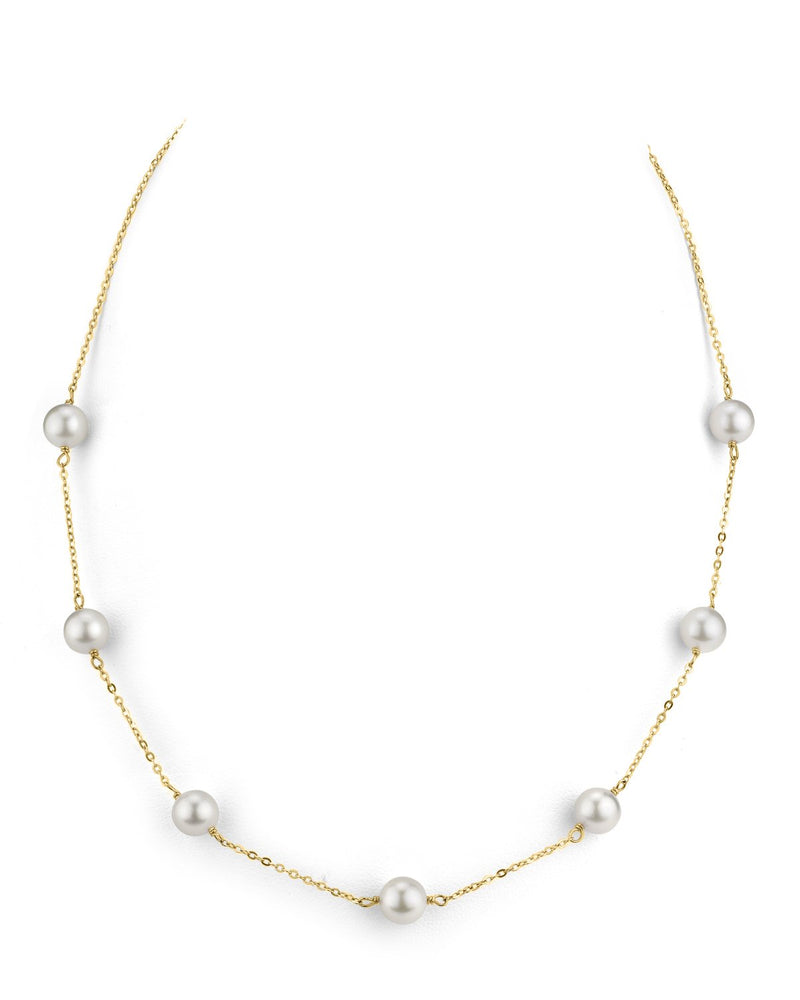 Due to popular demand, Pearls of Joy is pleased to present the chic and modern White Akoya Pearl Tin Cup Necklace, now as a regular item. Famous for their appearance in the movie 'Tin Cup' starring Kevin Costner and Rene Russo, the station-style necklace is a minimalist and chic take on a classic strand of pearls. Seven pearls are individually wire-wrapped into place to create a full 16 or 18-inch necklace.