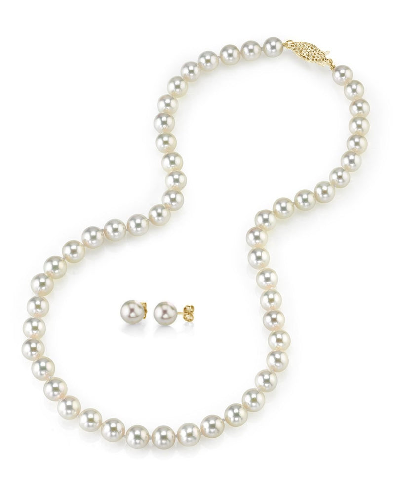 This glamorous Japanese Akoya Pearl Necklace and Earring Set is the treasure she's been waiting for. The mirror-sharp luster in these magnificent and rare pearls is attributed to the cold waters off the coast of Japan. The versatile 8.0-8.5mm saltwater pearls are hand-selected for their thick nacre, perfectly round shapes, clean surfaces, and sparkling overtones. Choose between AA+ Quality, or upgrade to AAA for even brighter luster and nearly flawless surfaces.