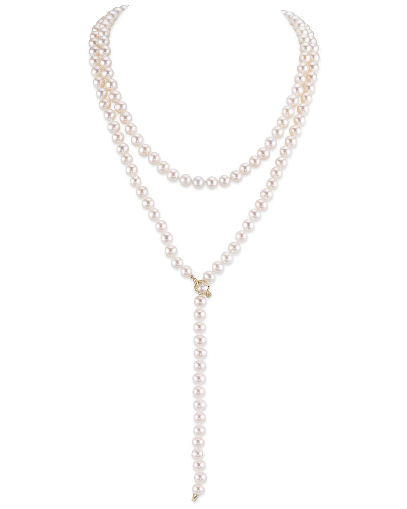 This exquisite lariat pearl necklace features AAAA quality white Freshwater pearls hand picked for their radiant luster. The pearls are strung and double knotted on the finest silk thread to a 51' rope length. The necklace is affixed with an adjustable 14K gold clasp that can be placed on any pearl on the strand for easy customization.